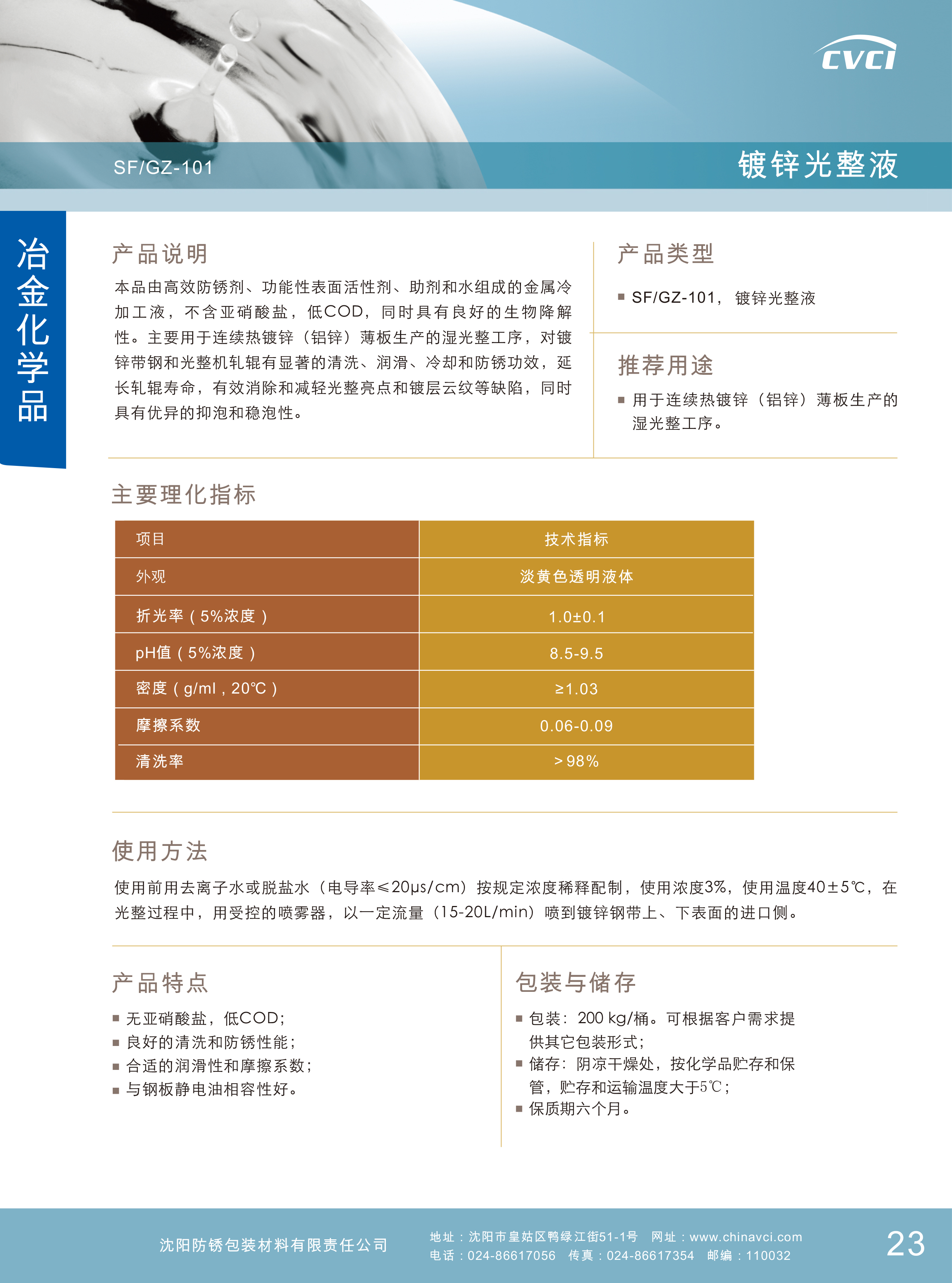 由高效防銹劑、功能性表面活性劑、助劑和水組成的金屬冷加工液,不含亞硝酸鹽,低COD,同時具有良好的生物降解性。主要用于連續(xù)熱鍍鋅(鋁鋅)薄板生產(chǎn)的濕光整工序,對鍍鋅帶鋼和光整機軋輥有顯著的清洗、潤滑、冷卻和防銹功效,延長軋輥壽命,有效消除和減輕光整亮點和鍍層云紋等缺陷,同時具有優(yōu)異的抑泡和穩(wěn)泡性。
