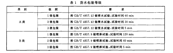 防水包裝等級(jí)分為A1級(jí)包裝、2級(jí)包裝、3級(jí)包裝和B1級(jí)包裝、2級(jí)包裝、3級(jí)包裝,詳見表1.